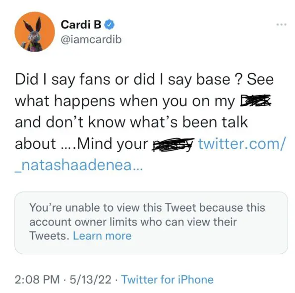 “Did I say fans or did I say base? See what happens when you on my d*ck and don’t know what’s been talked about… Mind your p*ssy.”
