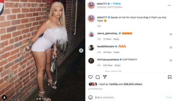 The video clip seemingly got Latto’s attention, as the Atlanta rapper soon after posted subtle shots of her own. In one post, Latto, 23, captioned a set of pictures: