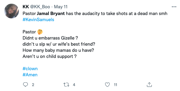 As the clip continued getting exposure, the pastors comments were met with very mixed reactions by social media users. Some people called Jamal a hypocrite, noting the “un-Godly” nature of condemning a dead man. Additionally, Jamal’s critizers reminded him of his past transgressions. Of them, includes stepping out on his ex-wife Gizelle Bryant and fathering other children, causing their split after 6 years of marriage.