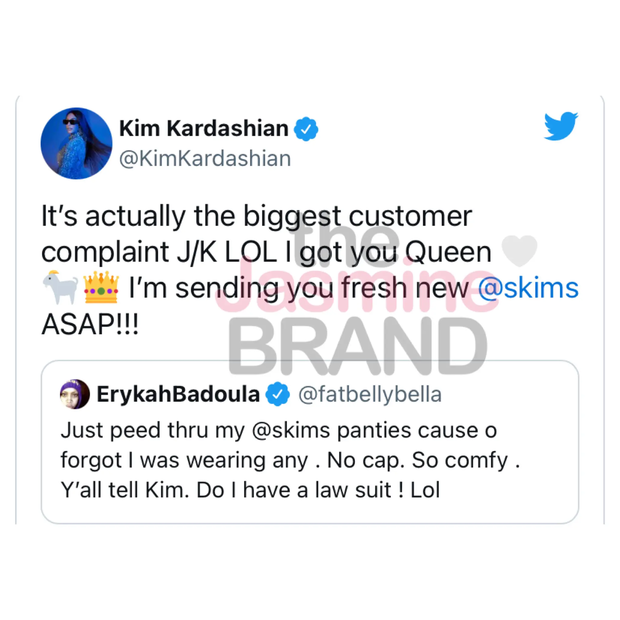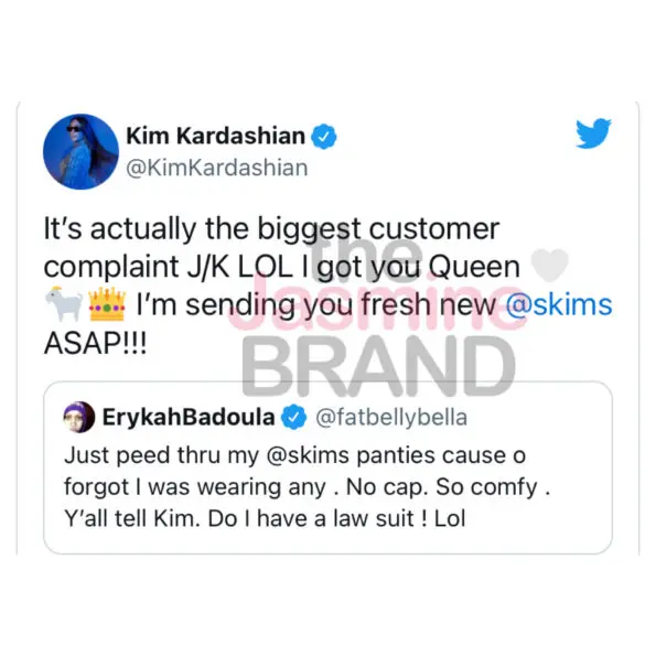 “It’s actually the biggest customer complaint J/K LOL I got you Queen [white heart, goat, and crown emojis]. I’m sending you fresh new @skims ASAP!!!”