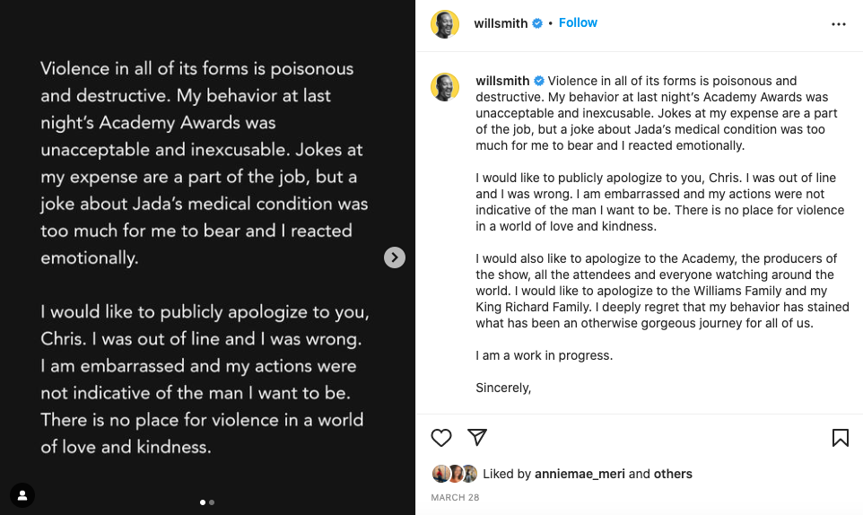 In an apology note, the King Richard star reasoned that his wife’s pain due to her ongoing struggle with alopecia caused his violent outburst of emotion. After winning his first Oscar for best actor, Will received a 10 year ban as a result of the hit.