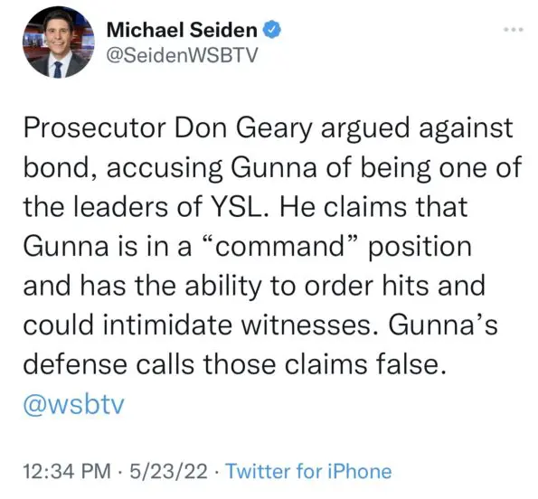 According to Seiden, prosecutors argued against Gunna’s bond due to him allegedly being one of the leaders of the YSL gang. He wrote: