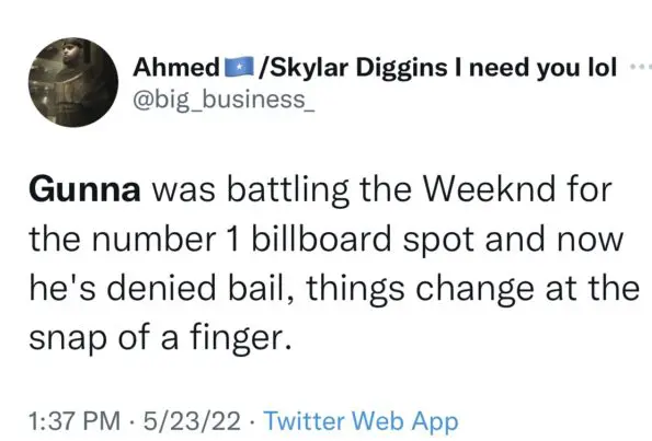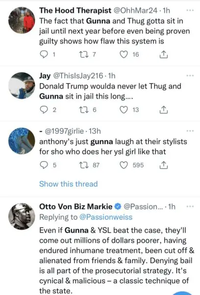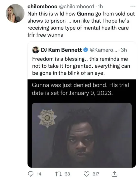 Many fans of Gunna took to social media to express their shock and disappointment that the “P Power” rapper was denied bond and will remain in jail. Some feel as though the legal system is trying to make an example out of him and Young Thug and possibly even ruin their careers.