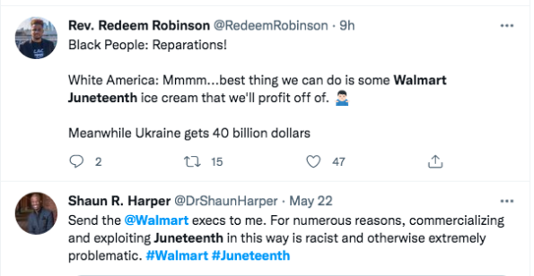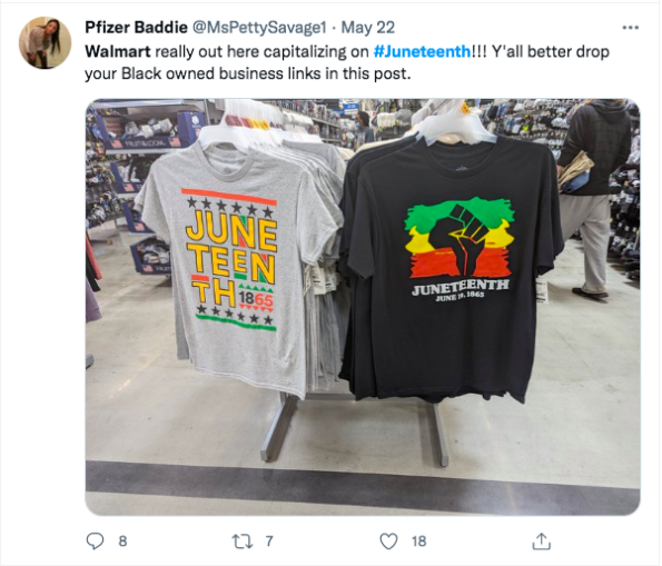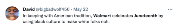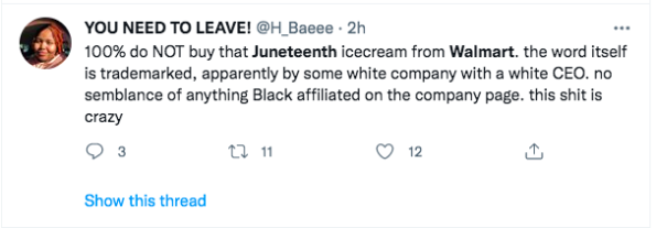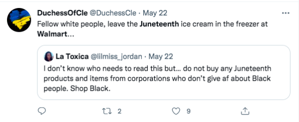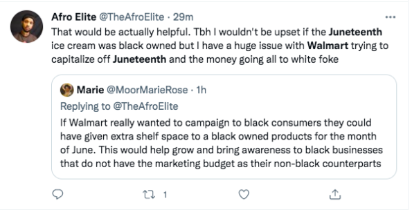 “Tbh I wouldn’t be upset if the Juneteenth ice cream was black owned but I have a huge issue with Walmart trying to capitalize off Juneteenth and the money going all to white foke”