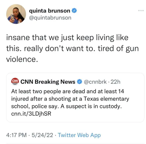 Abbots Elementary star Quinta Brunson said it’s “insane that we just keep living like this. really don’t want to” and that she’s “tired of gun violence.”