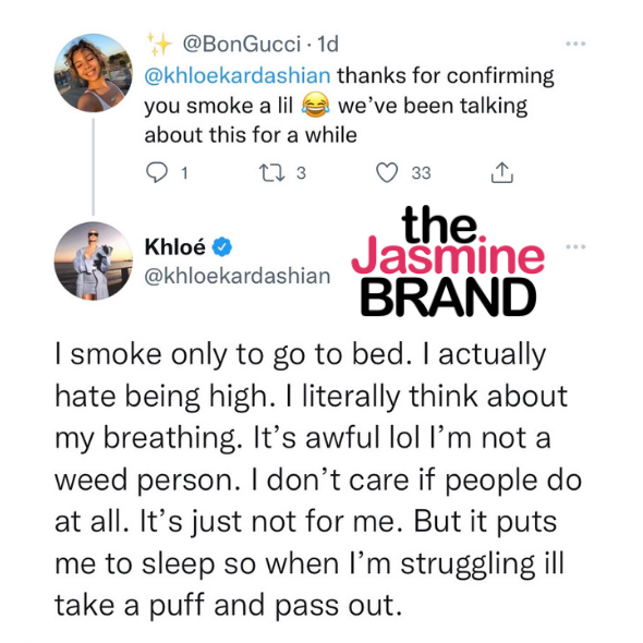 When another fan shared their excitement that Khloe does in fact smoke weed, the reality star explained more: