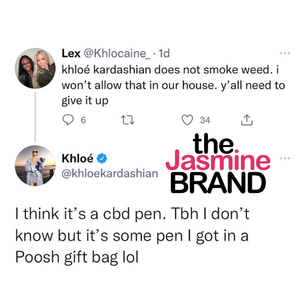 Twitter users had opinions and questions Wednesday (May 25) about Khloe Kardashian smoking weed. The conversation started after a fan denied that Khloe Kardashian is smoking weed in an old video that resurfaced online. The Good American owner replied to the comment and shared that she doesn’t like smoking weed. She also clarified what was in her hand in the old video and said,