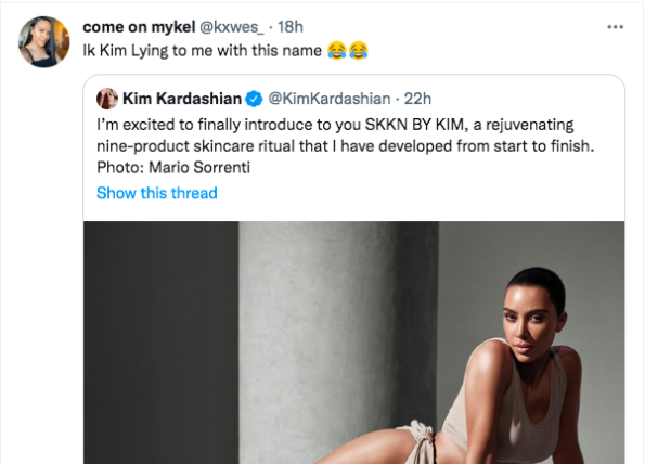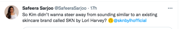 “So Kim didn’t wanna steer away from sounding similar to an existing skincare brand called SKN by Lori Harvey?”