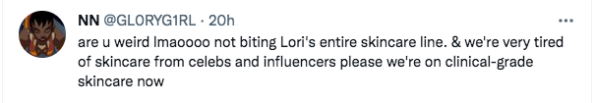 “are u weird lmaoooo not biting Lori’s entire skincare line. & we’re very tired of skincare from celebs and influencers please we’re on clinical-grade skincare now.”
