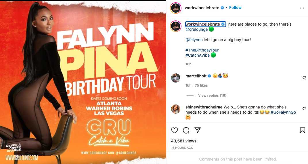 The “Falynn Pina Birthday Tour” will take place in several of Dennis‘ Cru Lounge’s across different states. There is no further information provided about the event at this time.