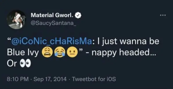 Via several tweets from 2014 and 2015, the “Booty” artist criticized a then 8-year-old Blue Ivy’s hair type calling it “nappy”, and went on to compare her aesthetically to then 8-year-old North West, the daughter of estranged couple Kanye West and Kim Kardashian.