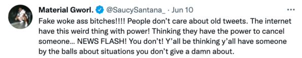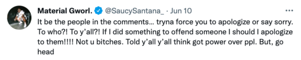 Of course, Saucy Santana, true to his name, didn’t back down from the fight. The rapper called out “fake woke” people and sounded off in a series of tweets, making it clear that if he did owe an apology, it wouldn’t be to internet users.