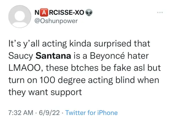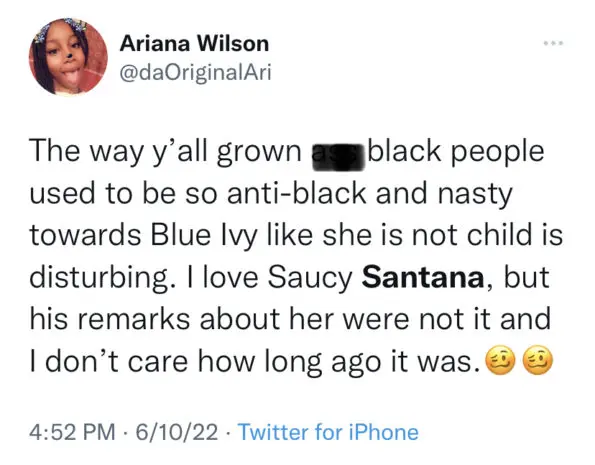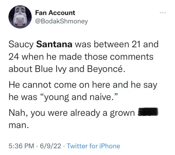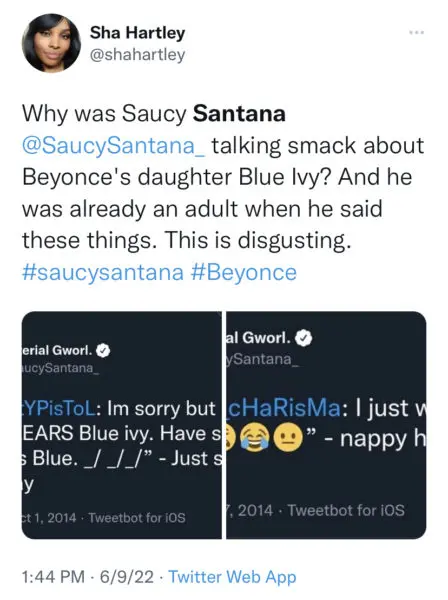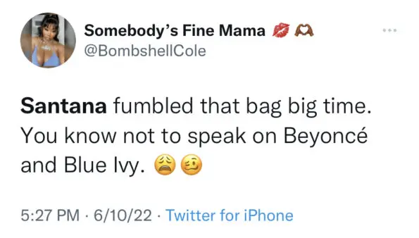 Following the resurfaced tweets going viral, many of Beyoncé’s very loyal fan group members, dubbed the “Beyhive”, made it known they were not here for the rappers comments. Many of them disparaged Santana for comparing the looks of children and called for a public apology.