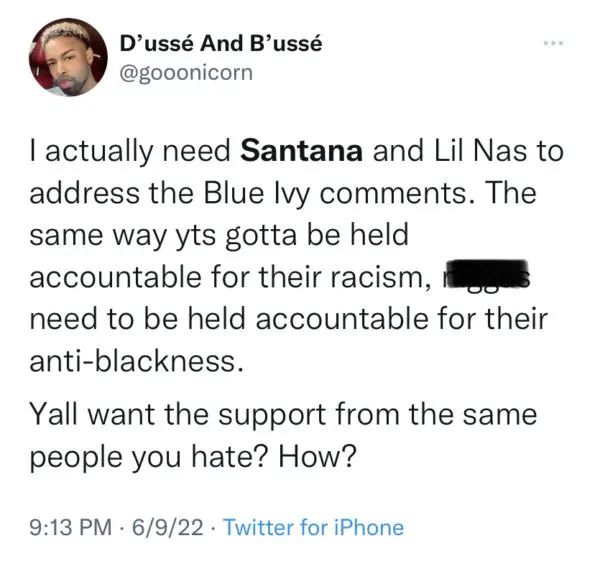 Almost a year later, previous tweets revealed Santana also had words for Blue Ivy’s famous mom, Beyoncé. In one tweet, the musician called the Lemonade artist “dry” and declared himself prettier than her, writing: