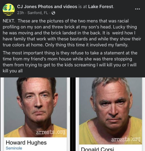 According to reports, 16-year-old Jermaine Jones was driving through a predominantly white neighborhood in Sanford, Florida recently while visiting a friend when a brick flew through his window. Video footage of the altercation shows Donald Corsi, 52, and Howard Hughes, 61, who live in the neighborhood, harassing the teen, accusing him of drag racing, and admitting to damaging his vehicle.