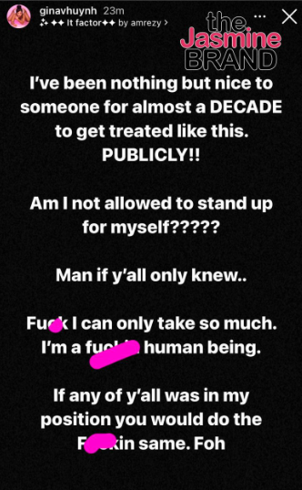 “I’ve been nothing but nice to someone for almost a DECADE to get treated like this PUBLICLY!! Am I Not allowed to stand up for myself?????….If any of of ya’ll was in my position you would do the F***in same. FOH”