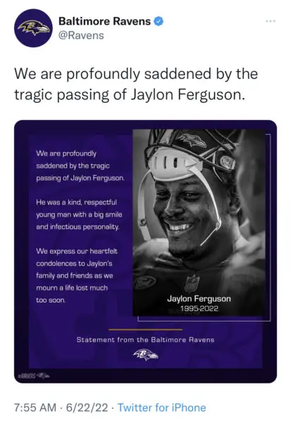 “We are profoundly saddened by the tragic passing of Jaylon Ferguson. He was a kind, respectful young man with a big smile and infectious personality. We express our heartfelt condolences to Jaylon’s family and friends as we mourn a life lost much too soon.”