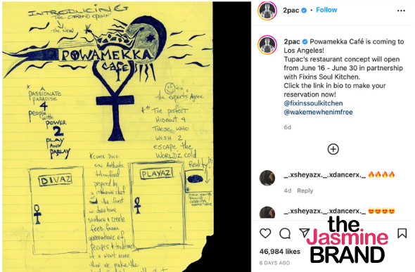 In September 1996, Tupac Shakur was shot four times in a drive-by shooting in Las Vegas. He passed away six days later at the age of 25. Before he died, he diligently wrote on a page of yellow-lined paper that he had dreams of owning a restaurant called the “Powamekka Cafe.” Tupac’s family shared a picture of the yellow note on his Instagram, indicating he wanted the place to have an aura for “divaz” and “playaz”: