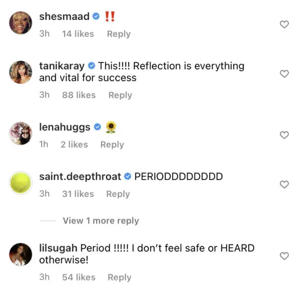 “I have a Black female OB. I have a Black female business manager. She’s here. I have a Black — you know one of my managers is a Black woman. Like for me, that for me is a safe space.”