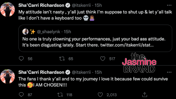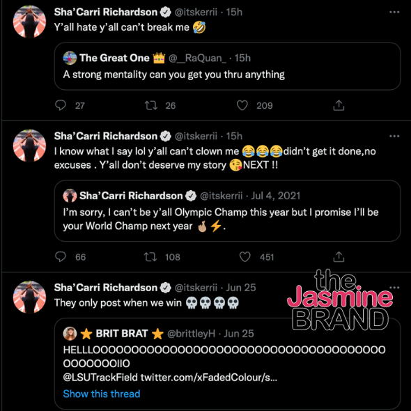 Richardson took it to Twitter to address scrutiny about her attitude post meets, while letting fans know the media can’t break her strong mentality. She also called out her college, Louisiana State University for only posting their athletes when they win.