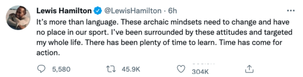 “Discriminatory or racist language is unacceptable in any form and has no part in society,” Formula 1 said. “Lewis is an incredible ambassador for our sport and deserves respect. His tireless efforts to increase diversity and inclusion are a lesson to many and something we are committed to at F1.”