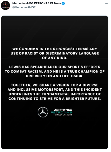 “We condemn in the strongest terms any use of racist or discriminatory language of any kind. Lewis has spearheaded our sport’s efforts to combat racism and he is a true champion of diversity on and off track. Together we share a vision for a diverse and inclusive motorsport and this incident underlines the fundamental importance of continuing to strive for a brighter future.”