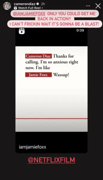 “Cameron I hope you aren’t mad I recorded this, but no turning back now. Had to call in the GOAT to bring back another GOAT. @CameronDiaz and I are BACK IN ACTION – our new movie with @NetflixFilm. Production starting later this year!!”