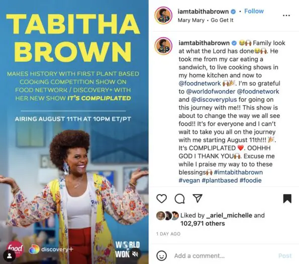 Tabitha Brown, 43, took to social media on Wednesday (Jun.30) to share the good news with her followers. Brown posted a promotional photo for the new series, It’s CompliPlated, and penned a lengthy message showing gratitude for the new opportunity. She wrote: