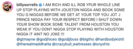 “YOU JOT J PRINCE N*GGA PAY YOUR RESPECT BEFORE I SHUT DOWN YOUR SHOW BOOK SOME TALENT FROM HOUSTON YOU WEAK IF YOU DONT N*GGA STOP PLAYING WITH HOUSTON N*GGA IT AINT NO JOKE !!!”