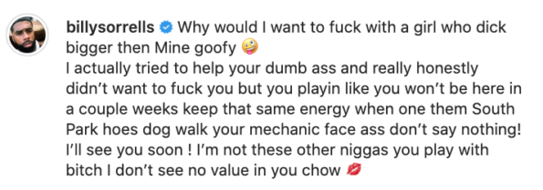 I actually tried to help your dumb a** and really honestly didn’t want to f*ck you but you playin like you won’t be here in a couple weeks keep that same energy when one them South Park h*es dog walk your mechanic face a** don’t say nothing! I’ll see you soon ! I’m not these other n*ggas you play with b*tch I don’t see no value in you chow”