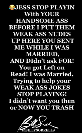 “JESS STOP PLAYIN With YOUR HANDSOME A** BEFORE I PUT THEM WEAK A** NUDES UP HERE YOU SENT ME WHILE I WAS MARRIED, AND DIdn’t ask FOR! You got Left on Read! I was Married, Trying to help your WEAK A** JOKES STOP PLAYING! I didn’t want you then or now YOU TRASH”