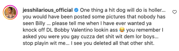 As Jess (and other social media users) noted, more of her comments to Billy seems to have disappeared from his page. In the now seemingly deleted comments, Jess accused Billy of having sexual relations with men, using cocaine, getting cheated on by his wife, and being a comedic flop.