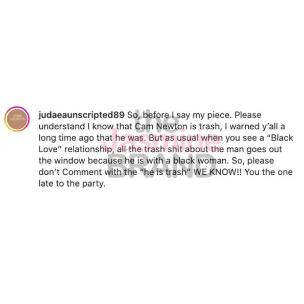 “So, before I say my piece. Please understand I know that Cam Newton is trash, I warned y’all a long time ago that he was. But as usual when you see a “Black Love” relationship, all the trash sh*t about the man goes out the window because he is with a black woman. So, please don’t Comment with the “he is trash” WE KNOW!! You the one late to the party.”