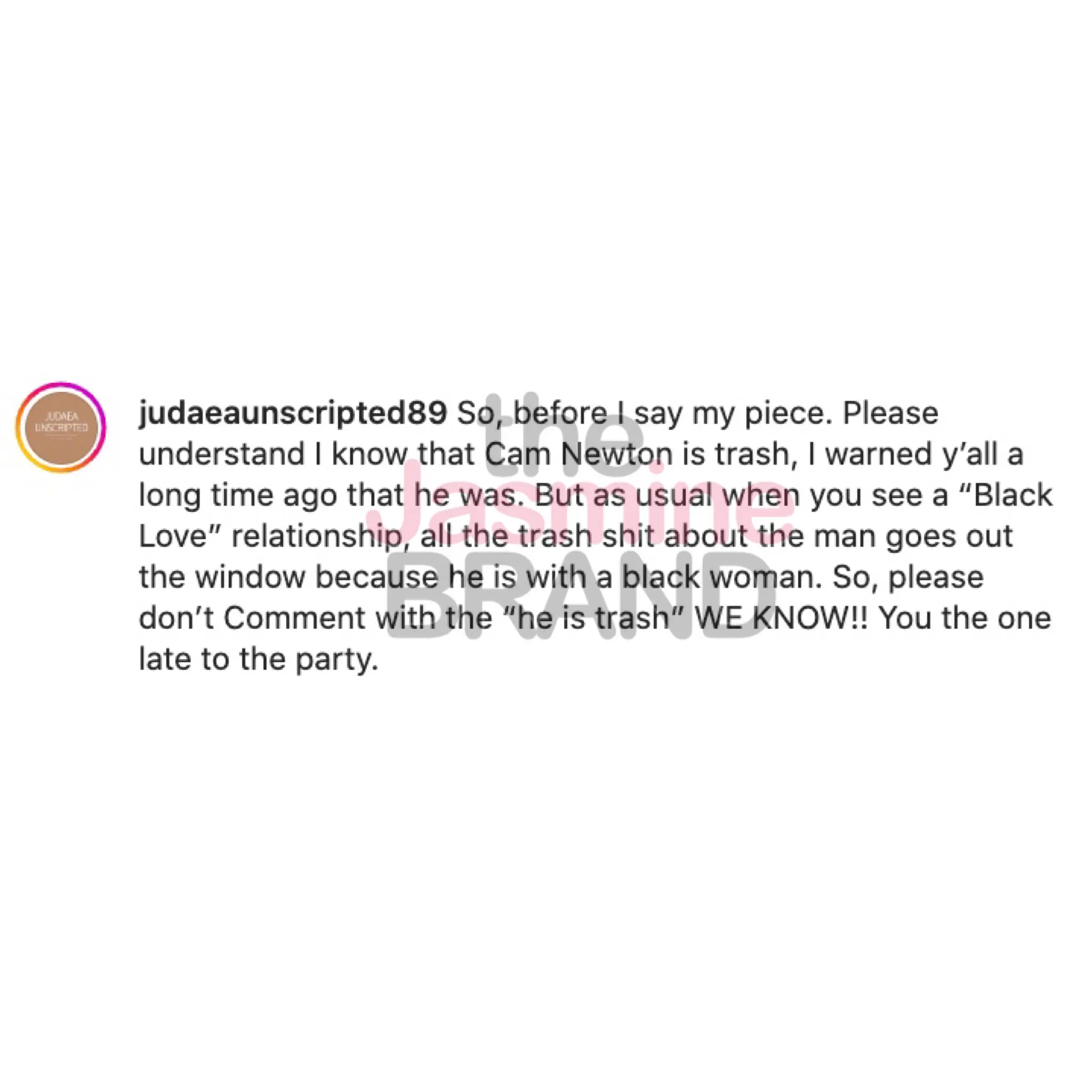 “So, before I say my piece. Please understand I know that Cam Newton is trash, I warned y’all a long time ago that he was. But as usual when you see a “Black Love” relationship, all the trash sh*t about the man goes out the window because he is with a black woman. So, please don’t Comment with the “he is trash” WE KNOW!! You the one late to the party.”