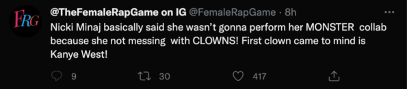 A clip of #NickiMinaj cutting off her hit song “Monster” with #Kanye has gone viral. Nicki says “I don’t f**k with clowns!” pic.twitter.com/qf5Xflnxt9