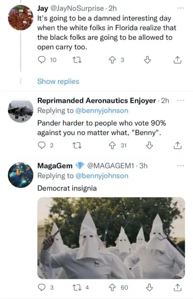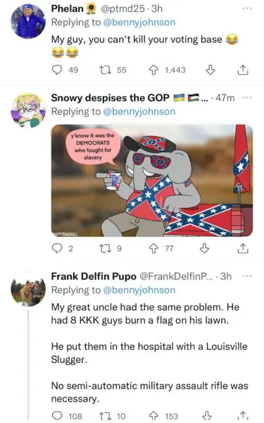 “Democrats like to say that no one needs an AR-15 for self defense. That no one could possibly need all 30 rounds. But when this rifle is the only thing standing between your family and a dozen angry Democrats in Klan hoods, you just might need that semi-automatic. And all 30 rounds.”