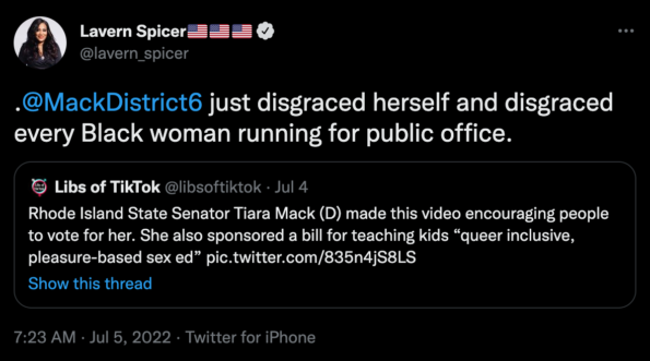 Lavern Spicer, a Black woman and Republican candidate running for Congress in Miami, Florida responded to Mack’s viral clip on her Twitter account, saying:
