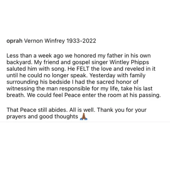 Very sad news. Oprah Winfrey’s father, Vernon Winfrey, has passed. His death, comes a few days after she hosted an outdoor celebration for him.