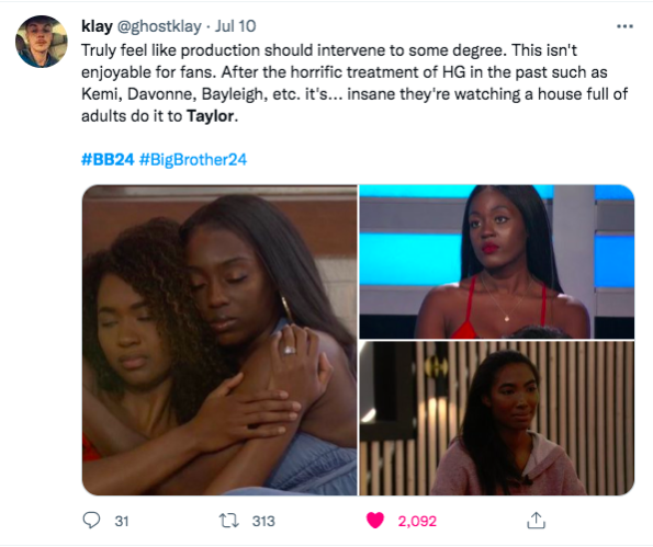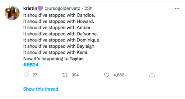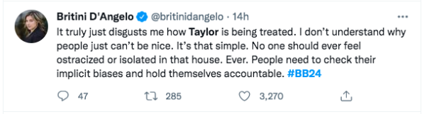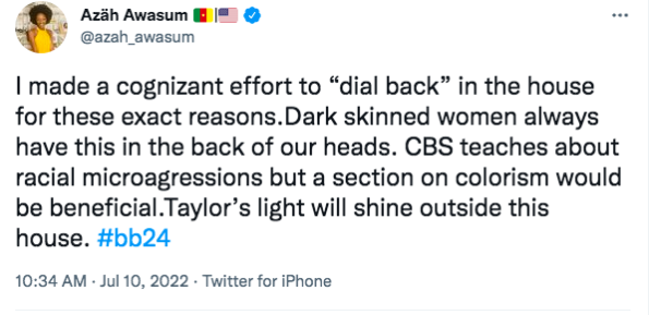 I made a cognizant effort to “dial back” in the house for these exact reasons.Dark skinned women always have this in the back of our heads. CBS teaches about racial microagressions but a section on colorism would be beneficial.Taylor’s light will shine outside this house. #bb24