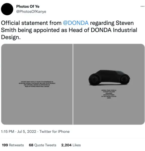 The musical genius turned entrepreneur is showing no signs of slowing down. As previously reported, Kanye West revealed that he is now stepping into the motor industry! The “Praise God” rapper took to social media last week to introduce a “Donda Concept Foam Vehicle” that might go into production with Tesla. “Donda” is the name of Kanye West’s late mother and is also the name of his 10th and 11th studio albums. During the “Donda” car reveal it was also announced that Steven Smith has been appointed head of industrial design for the project. The statement shared that Steven Smith has,