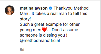 In a post on her Instagram page, Tina Lawson reshared a clip of Method Man recalling the encounter. Her caption said: