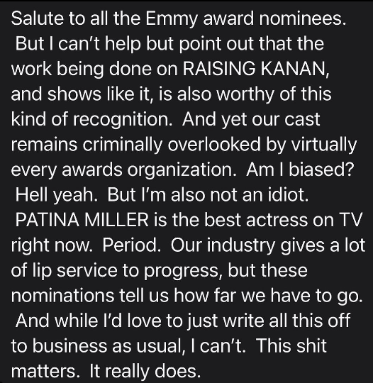 “Am I biased? Hell yeah. But I’m also not an idiot. PATINA MILLER is the best actress on TV right now. Period. Our industry gives a lot of lip service to progress, but these nominations tell us how far we have to go. And while I’d love to just write all this off to business as usual, I can’t. This sh*t matter. It really does.”