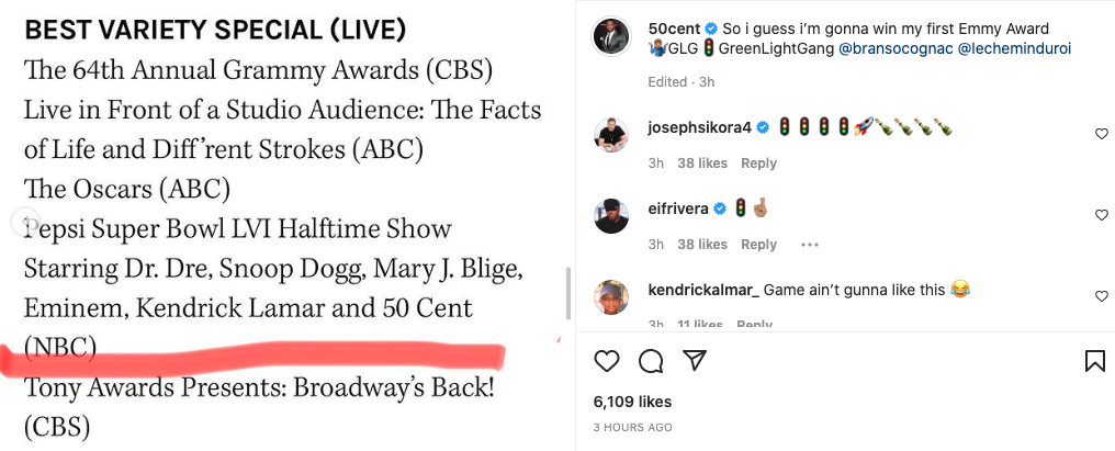 While users in the comments agreed with Penn on Miller’s snub, it seems 50 Cent isn’t all too bothered. The entertainment mogul took to his Instagram account to highlight his own Emmy nomination. Reposting his Super Bowl Halftime performance nomination, alongside Dr. Dre, Snoop Dogg, Mary J. Blige, Eminem, and Kendrick Lamar for Best Variety Special (Live), 50 wrote: