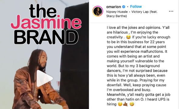 “I love all the jokes and opinions. Y’all are hilarious , I’m enjoying the creativity . If you’re lucky enough to be in this business for 22 years you understand that at some point you will experience malfunctions. It comes with being an artist and making yourself vulnerable to the world. But to my 3 background dancers, I’m not surprised because this is how y’all always been, even while in the group. Praying for my downfall. Well, keep praying cause I’m overbooked and busy. Meanwhile, y’all really gotta get a job other than hatin on O. I heard UPS is hiring .”