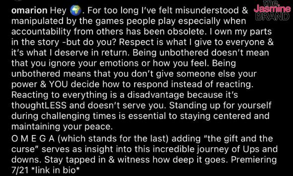 “Hey world. For too long I’ve felt misunderstood & manipulated by the games people play especially when accountability from others has been obsolete. I own my parts in the story -but do you? Respect is what I give to everyone & it’s what I deserve in return. Being unbothered doesn’t mean that you ignore your emotions or how you feel. Being unbothered means that vou don’t give someone else vour power & YOU decide how to respond instead of reacting. Reacting to everything is a disadvantage because it’s thoughtLESS and doesn’t serve you. Standing up for yourself during challenging times is essential to staying centered and maintaining your peace. O ME G A (which stands for the last) adding “the gift and the curse serves as insight into this incredible journey of Ups and downs. Stav tapped in & witness how deep it goes. Premiering 7/21 *link in bio*”