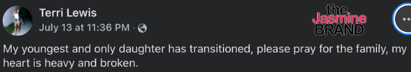 “My youngest and only daughter has transitioned, please pray for the family, my heart is heavy and broken.”
