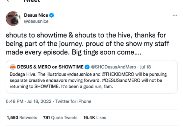 “Desus Nice and The Kid Mero will be pursuing separate creative endeavors moving forward. Showtime’s late-night talk show ‘Desus & Mero’ will not be returning for a fifth season.”