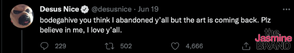 “Bodegahive you think I abandoned y’all but the art is coming back. Plz believe in me, I love y’all.”