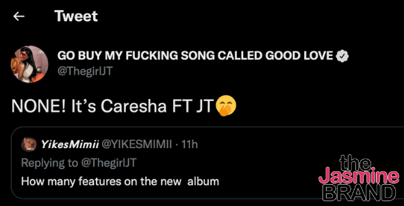 A fan questioned if their album was coming out this month. JT, born Jatavia Shakara Johnson, replied: