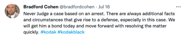 “Never Judge a case based on an arrest. There are always additional facts and circumstances that give rise to a defense, especially in this case. We will get him a bond today and move forward with resolving the matter quickly. #kodak #kodakblack”